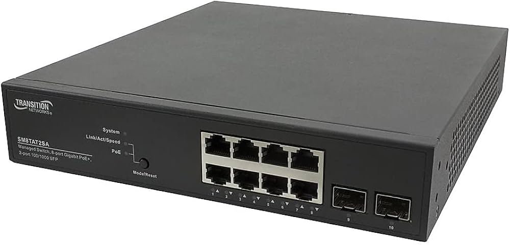 Transition Networks 8-Ports 10/100/1000BASE-T PoE+ Managed Network Switch with 2-Ports SFP – SM8TAT2SA-NA